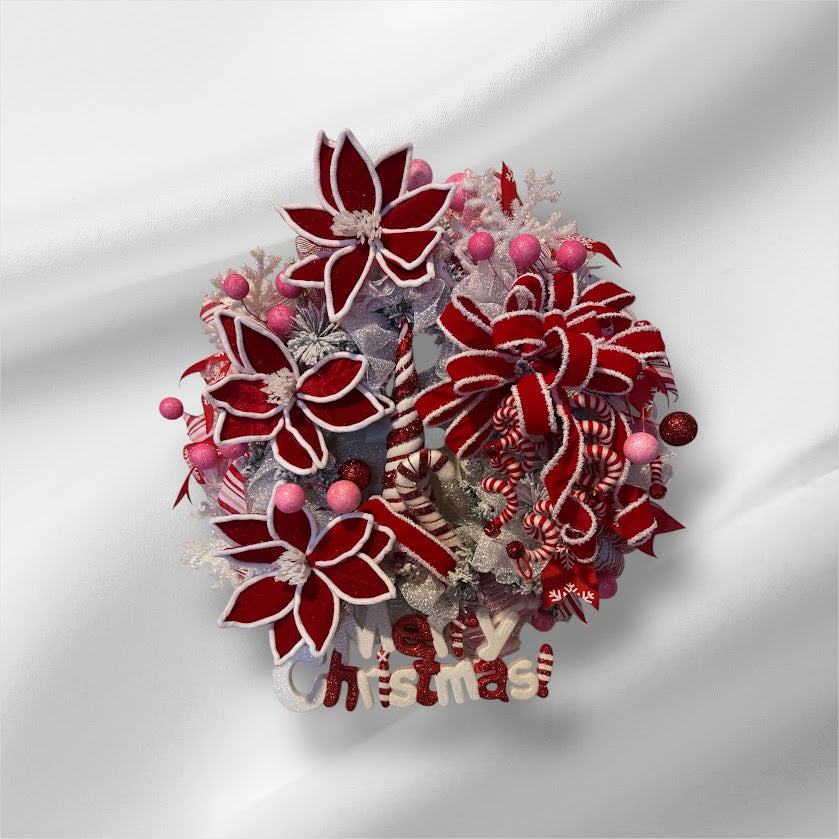 Add a festive touch to your holiday season with this stunning handmade Christmas wreath, designed to bring warmth and joy to your home. This wreath features vibrant red poinsettias, candy cane stripes, and an assortment of pink and red ornaments, perfectly arranged to capture the magic of Christmas. Crafted with care, each element is chosen to create a wreath that's not only visually striking but also built to last, making it a beautiful addition to your holiday decor collection.