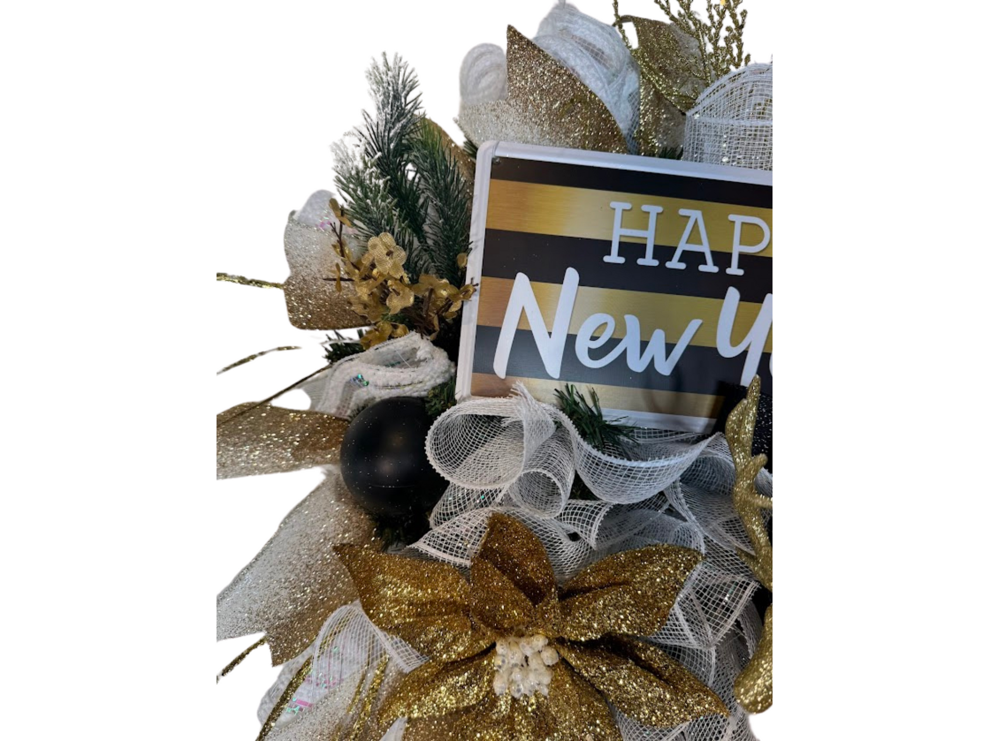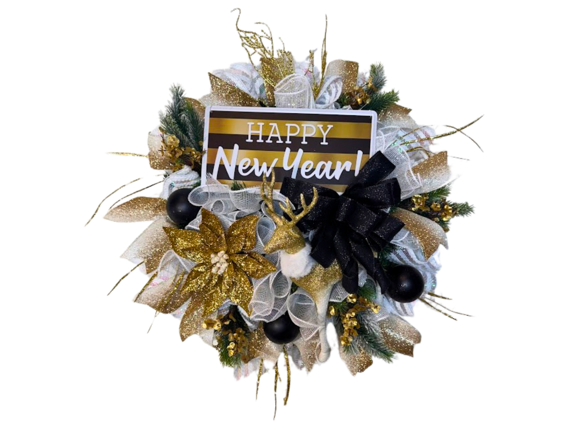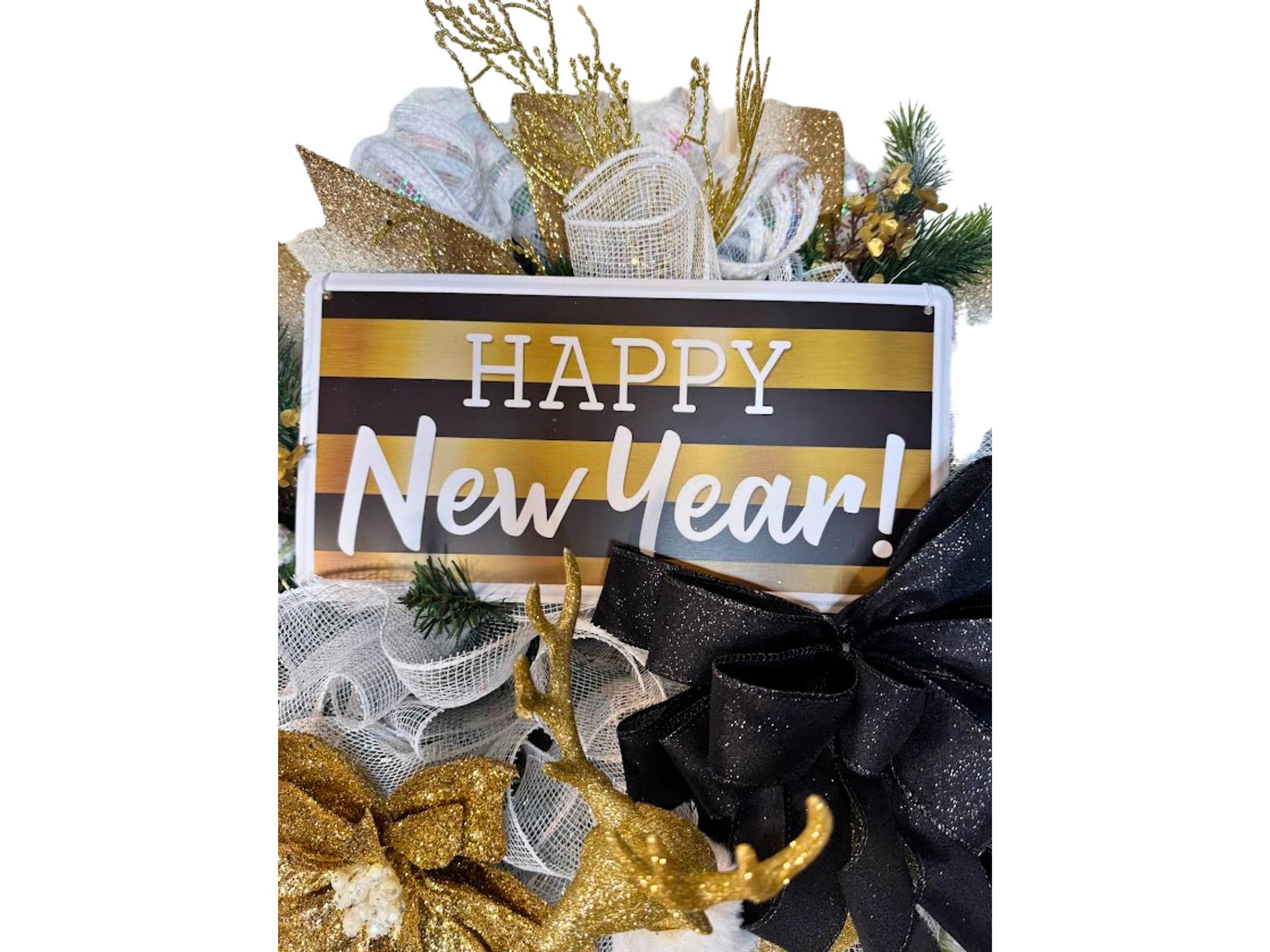 Celebrate the arrival of the New Year with this elegant handmade wreath. Designed with shimmering gold and black accents, glittering details, and a festive 'Happy New Year' sign, this wreath is perfect for front doors, parties, or as a holiday gift. Measuring approximately 25 inches, it adds sophistication and charm to any entryway. Each piece is crafted with care using high-quality materials to ensure durability. Make your New Year's celebration unforgettable—order your wreath today and greet guests in style!"