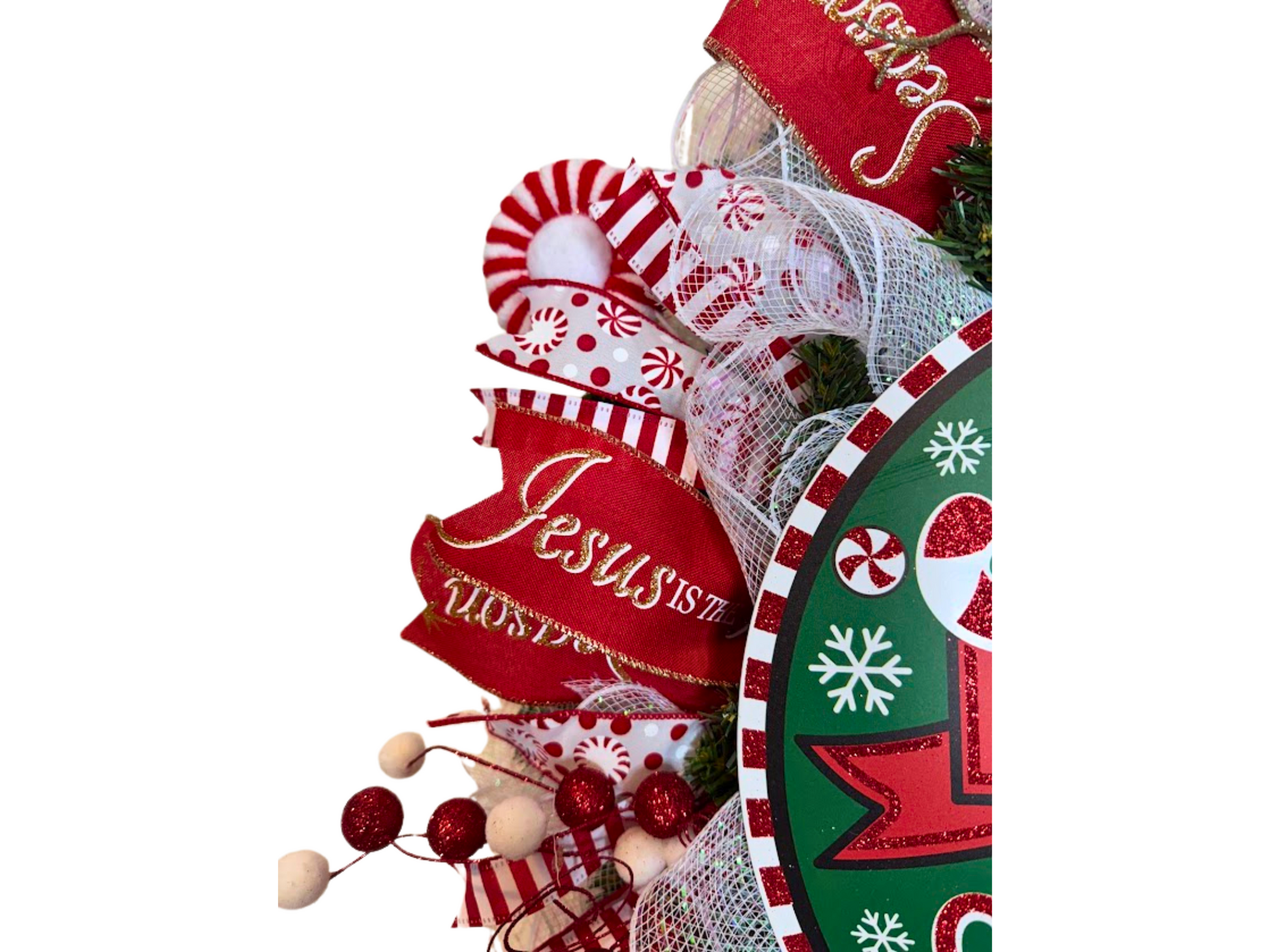 Handcrafted with care, the wreath is made from high-quality materials, including sturdy mesh ribbons, bright peppermint swirls, and a central "Jesus Is the Reason" sign, ensuring durability throughout the holiday season and beyond. With its vibrant colors and intricate detailing, this wreath is sure to catch the eye and spread joy to all who pass by your home.
