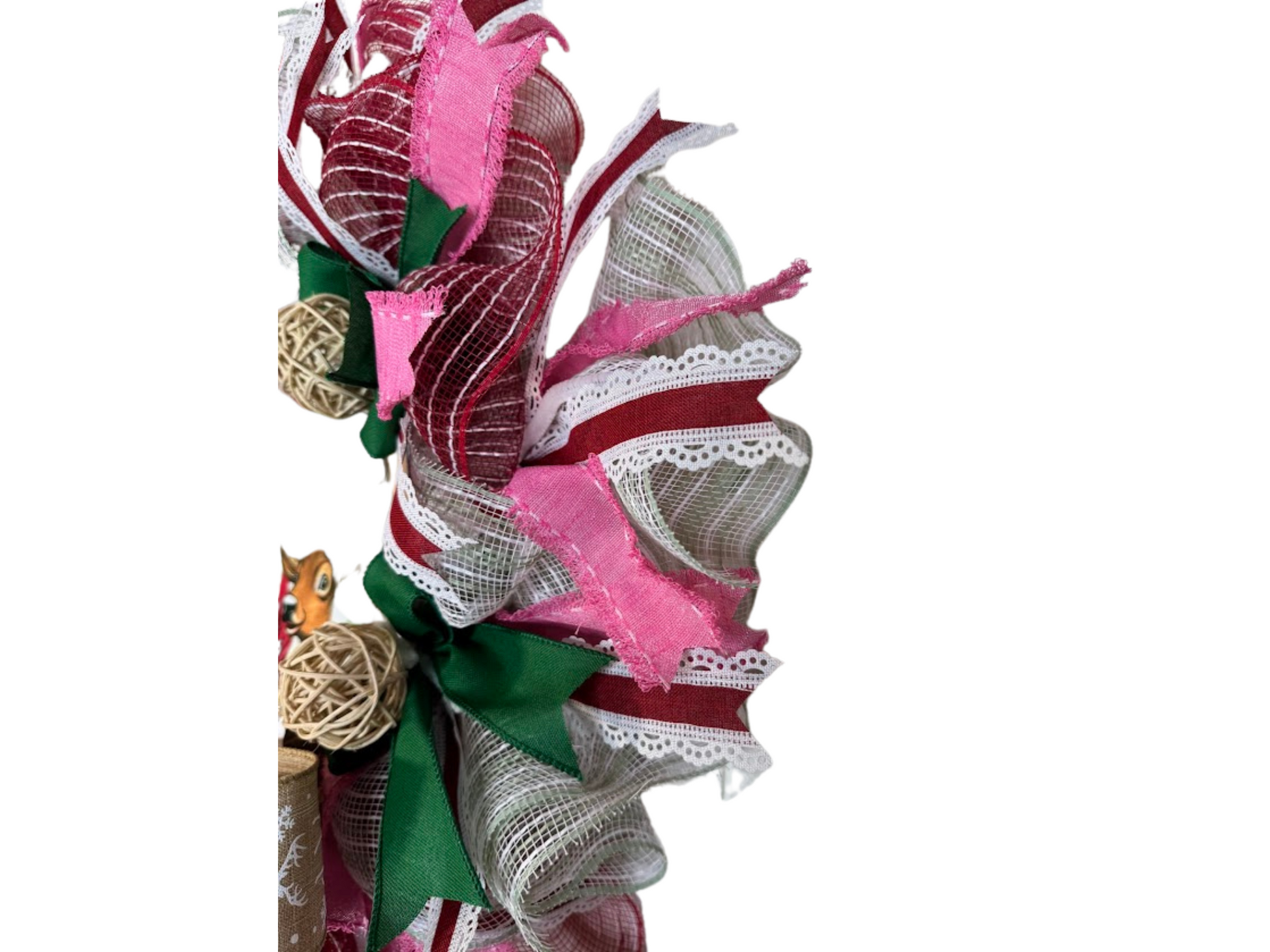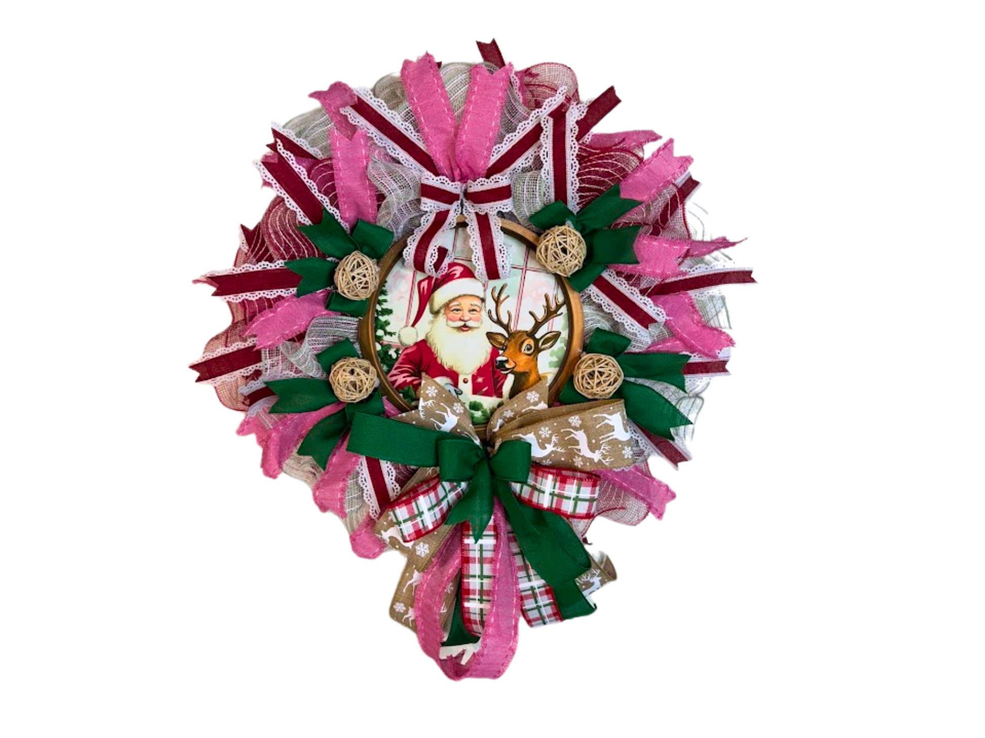 Add festive charm to your home this holiday season with this handmade Santa and Reindeer Christmas Wreath. This rustic yet whimsical wreath features a central design of Santa and his reindeer, surrounded by a blend of pink, green, and burlap accents, topped with plaid ribbons and decorative rattan balls. Measuring approximately 20 inches in diameter, it's the perfect size to adorn your front door, wall, or fireplace mantel and made to fit between storm doors.