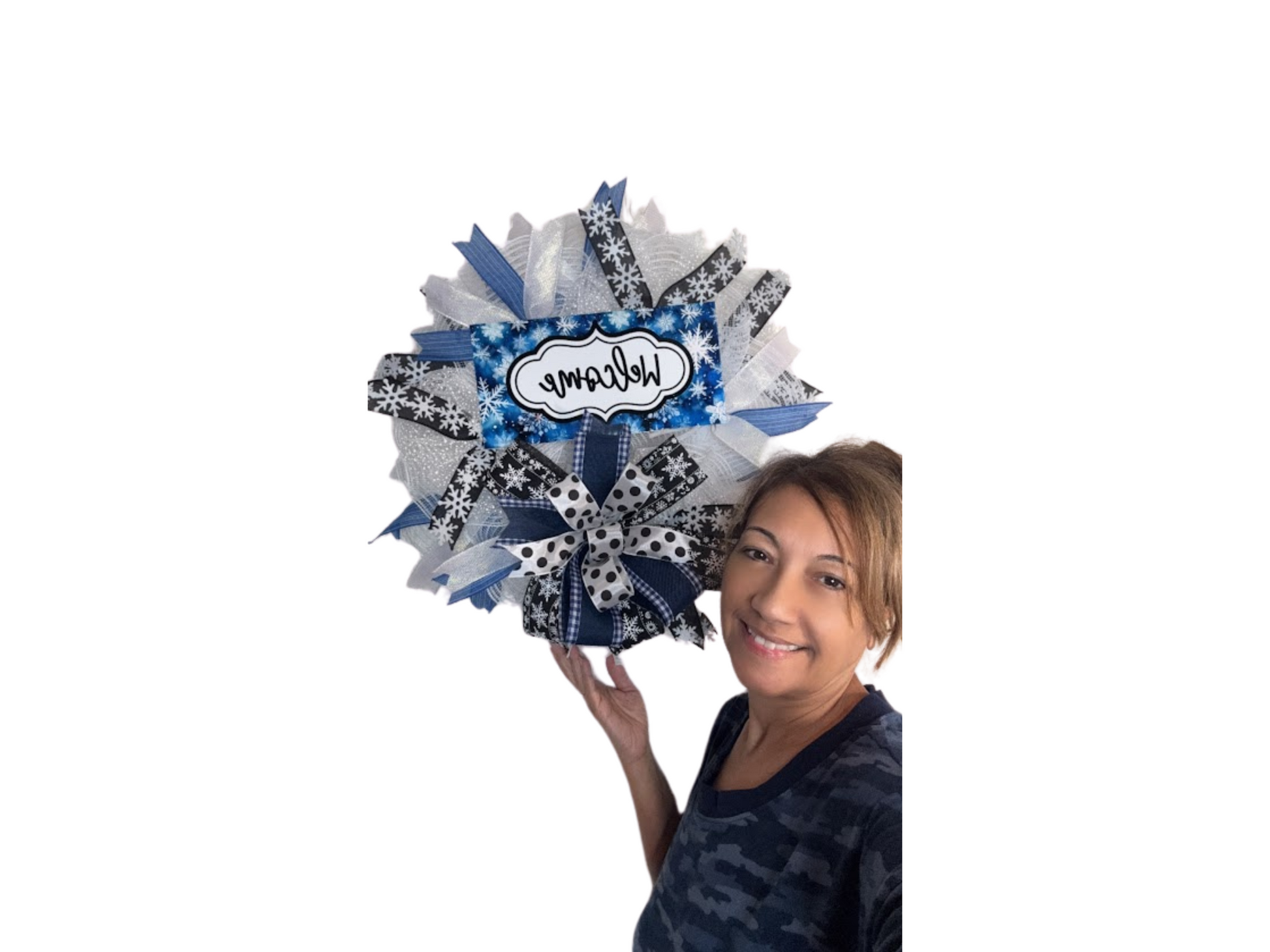 Bring the magic of winter to your home with this stunning handmade welcome wreath. Featuring a unique snowflake design, a bold mix of blue and white ribbons, and a cheerful 'Welcome' sign, this wreath adds charm and warmth to any front door. Perfect for celebrating the holiday season or enhancing your winter décor, it’s crafted with high-quality materials for lasting beauty.